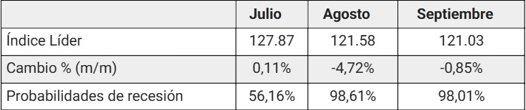 La tabla clave del informe permite observar la evolución de la probabilidad de recesión para los meses previos. En mayo, la probabilidad se situó en 57,08%; en junio, en 56,16%. En julio se mantuvo en 56,16% y finalmente, en agosto, trepó a 98,61%. Es el registro más alto informado desde, al menos, 2018. El salto mensual queda también reflejado en el gráfico evolutivo incluido en el informe, donde la curva muestra un cambio abrupto de pendiente en el último período.